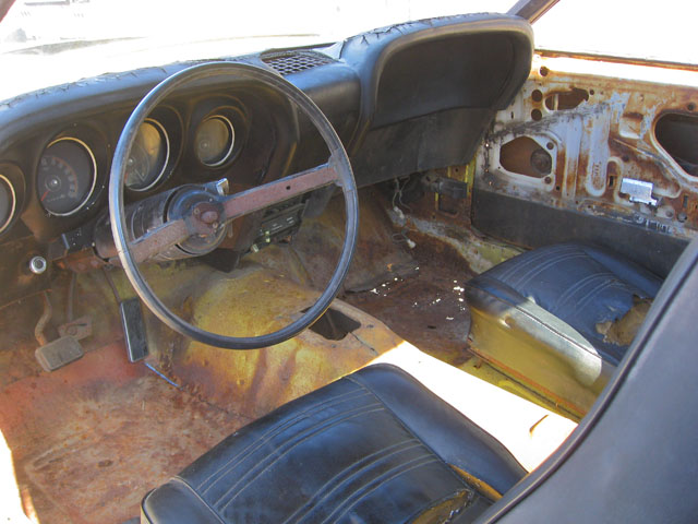 This car has its original high back bucket seats and the rear seat. The instrument panel is there, but the car will need a new dash pad, which is normal. For new upholstery, carpet and dash pad, add $900 for the parts, or $1500 installed.