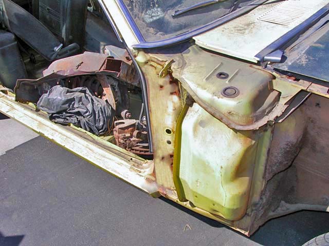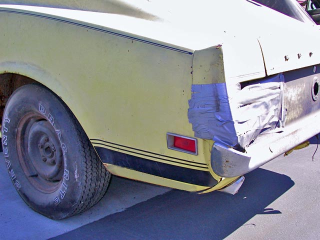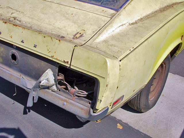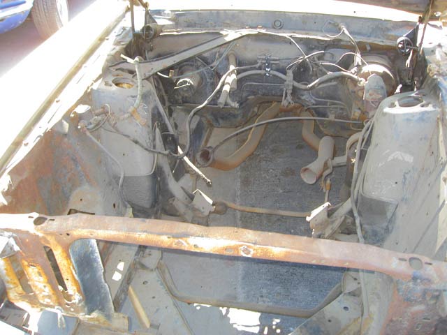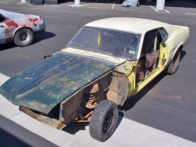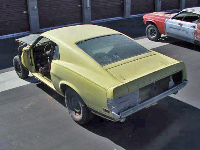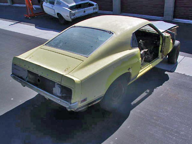 This yellow boss 302 originally had black interior, a rear deck spoiler, optional 3.91 axle ratio, deluxe steering wheel, shaker, console, power steering, tach. Even though the car looks bare, all it really needs is a set of doors and fenders.
