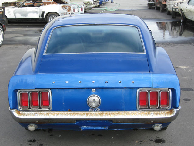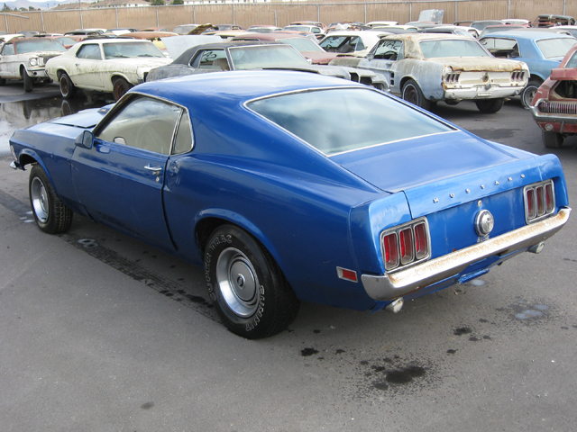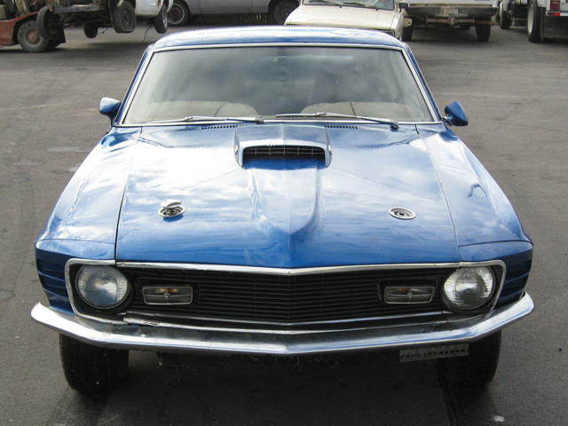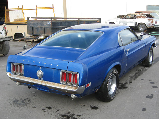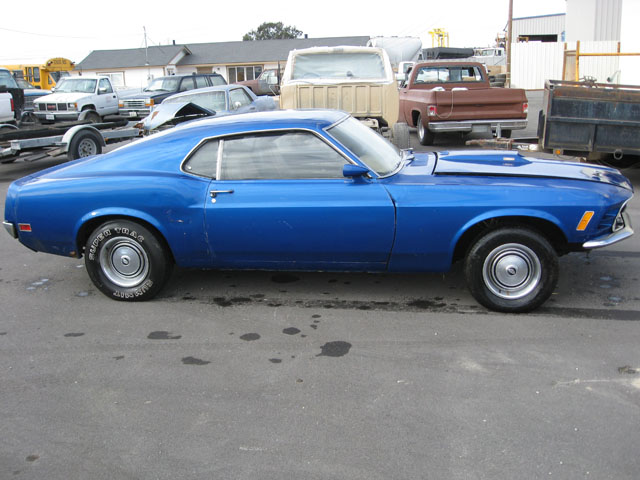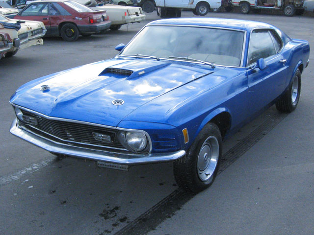THIS was originally a beautiful yellow 1970 MACH 1 MUSTANG WHICH NEEDS RESTORED, but it is now painted Blue. Options included power steering and power brakes with a Black Clarion Knit /Corinthian interior and Black hood stripe. The Mustang’s 351 Cleveland ran rough when first purchased, but it did run. This Mach would make an easy project car which would be worth at least $27,000 to $33,000 when restored. . The original 351 Cleveland engine and FMX Transmission are with the car. There is some rust work needed to make this car a show stopper, including bottom of doors, floor pans, and the lower area behind the rear wheels, plus a couple of spots in the trunk, but the frame rails and torque boxes are good. The normal interior redo, engine rebuild, and transmission will need to be checked out. The fenders and hood look straight and are rust free (nice pieces).. The car has the original quarter panels. Doors and rear deck also look original.