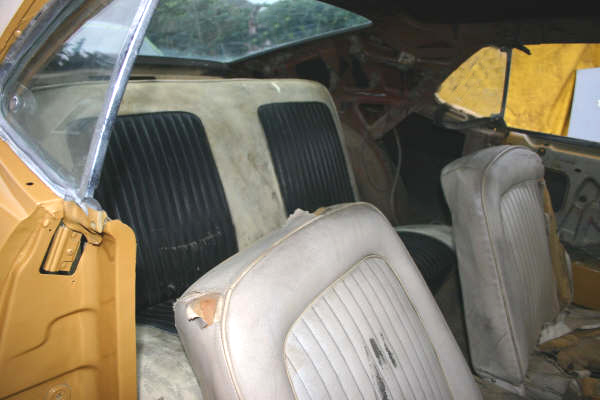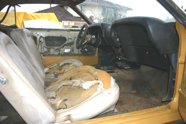 All the wiring is in the car and seems to be in good condition. Dash is in good shape but the dash pad will need replacing or recovering. Seats.. Are white front buckets, which of course will need to be reupholstered. Originally this Mustang came with a black interior. A Bright Gold exterior and Black interior is a great combination. Door panels are missing but you would probably want new ones anyway.