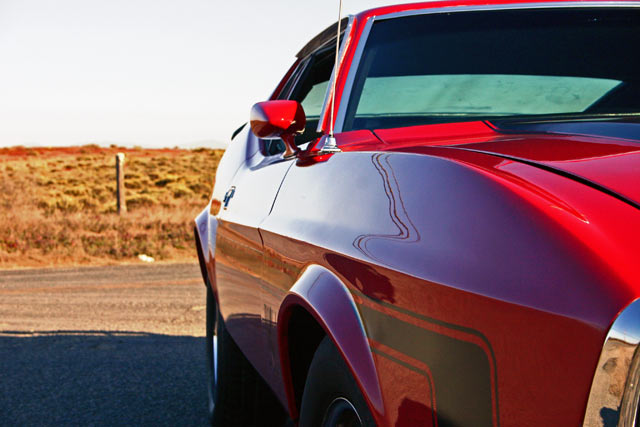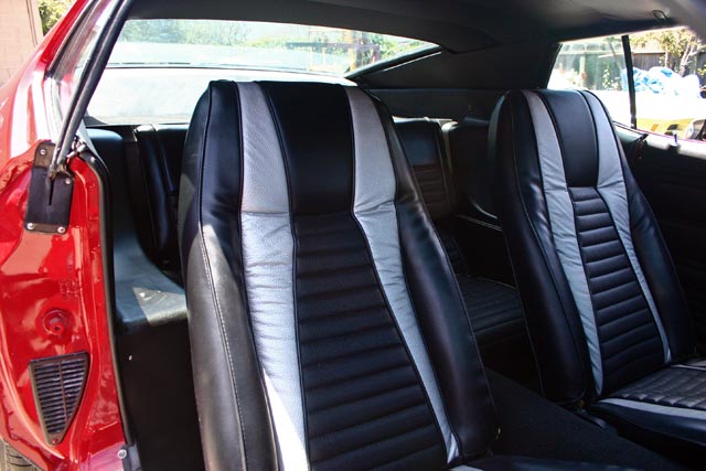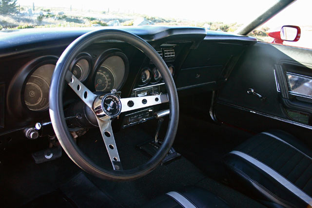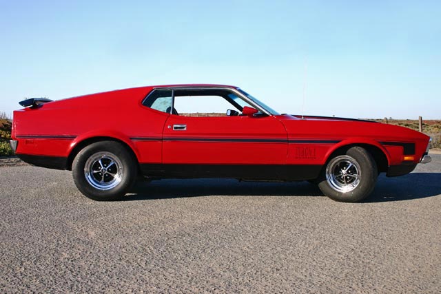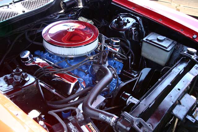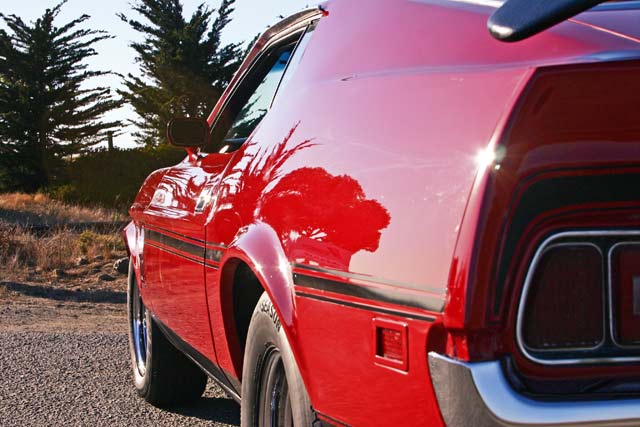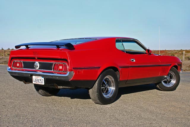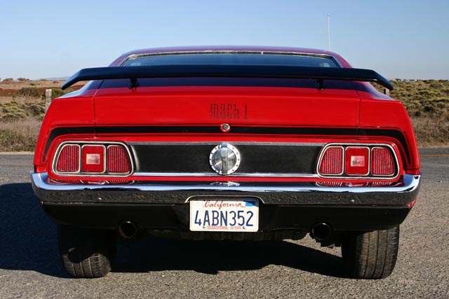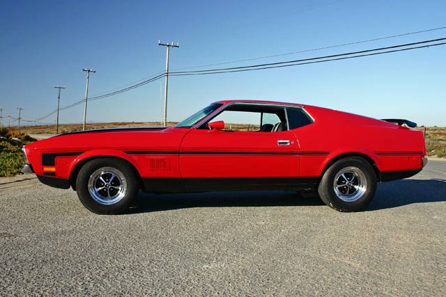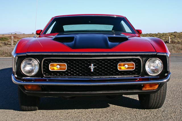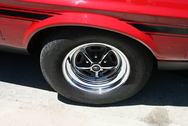 The body on this Mustang is straight and clean. The exterior is Bright Red with black Mach 1 stripes and painted rocker panels. There are Mach 1 decals on the fenders and trunk. The Mach 1 hood looks tough with the dual vents and matte black paint. The car has color matched sport mirrors. There is new chrome front fender extensions and hood trim. There are new chrome front and rear bumpers.