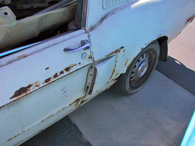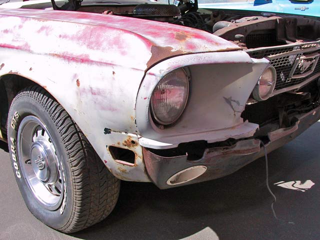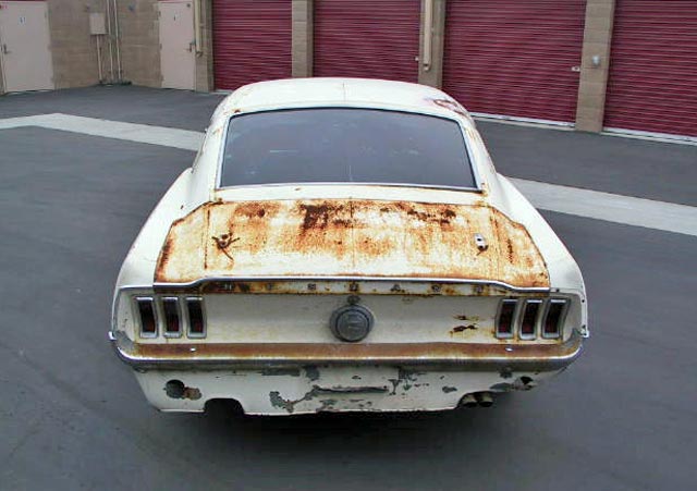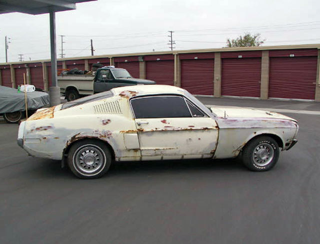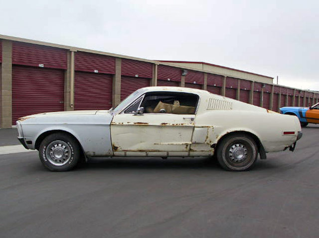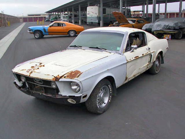 Great car for 68 GT350 clone or restoration. Fairly complete. Needs rust repair. Woodgrain dash w/ Tach. GT hubcaps and gas cap. Original engine w/ original carb. Power steering. Auto. Could be daily driven. Exterior color: White/grey/red/rust. Parts in car: Lots of body parts
