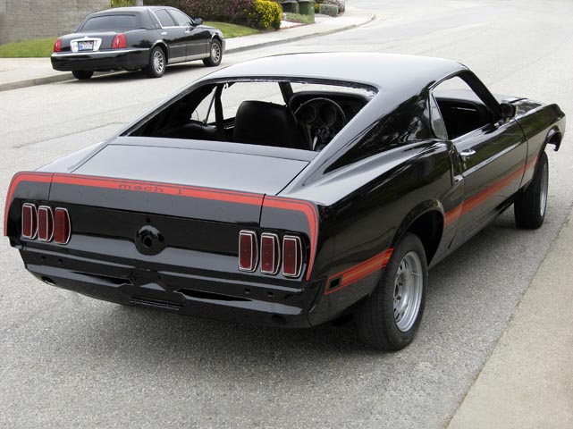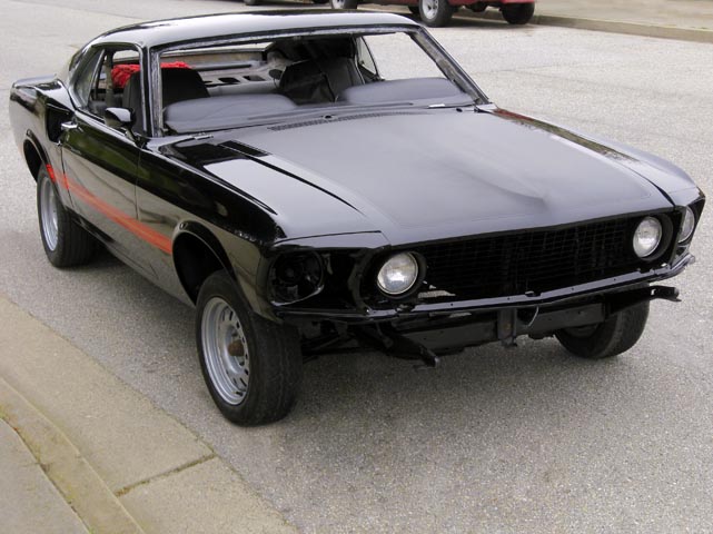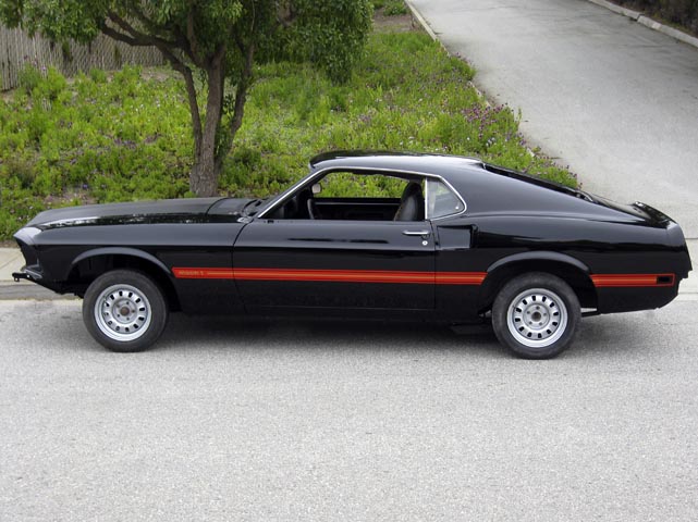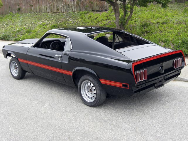 A Black on Black Stalion ! one of the most desirable color combinations if you want a truly elegant "R" Code (Shaker Hood Scoop) Mach 1. With its C-6 Automaticl transmission, and 3.50 axle ratio, plus its 4 bbl 428 big block engine this Mach 1 is for serious drivers only. It will need some work to come to life, but the Black on Black combo will look sharp when finished. When properly restored, this Black Stalion will be worth the effort. Easily worth $37,000 to $43,000 when restored. Black Clarion Knit/Vinyl High Back Bucket Seats, and AM Radio make this a low option Mach 1 which is ready for anything you want to add. You might want to add disk brakes all around, just to stop this steed, especially, if you are going to race the car.