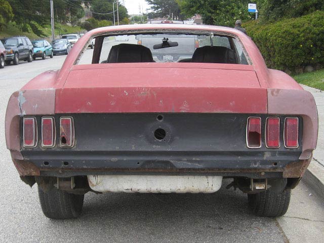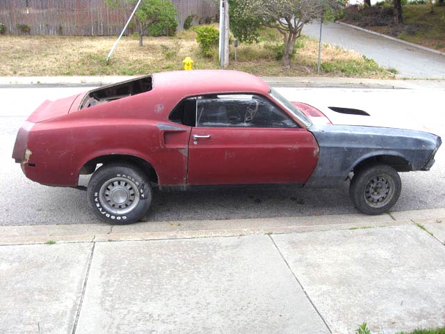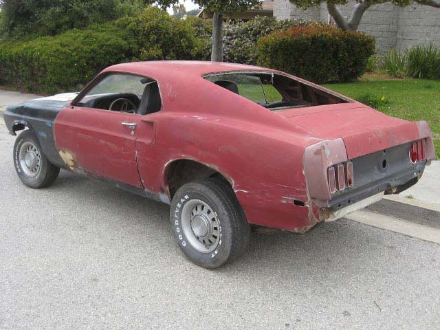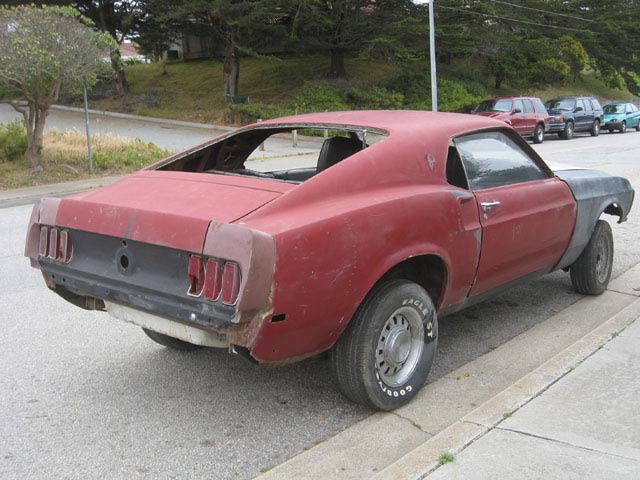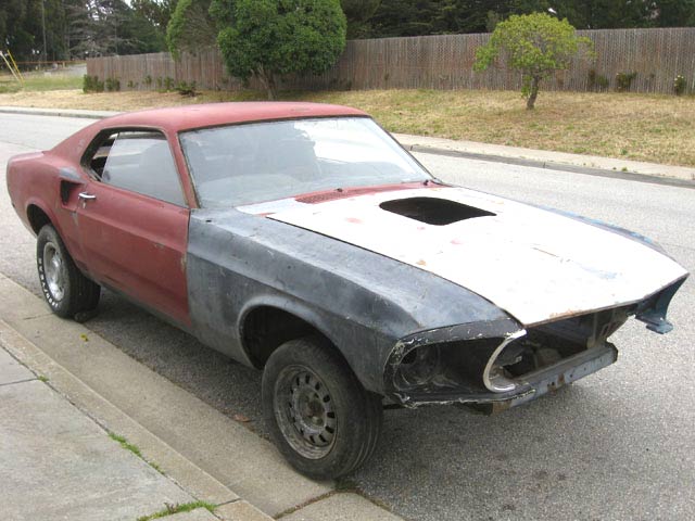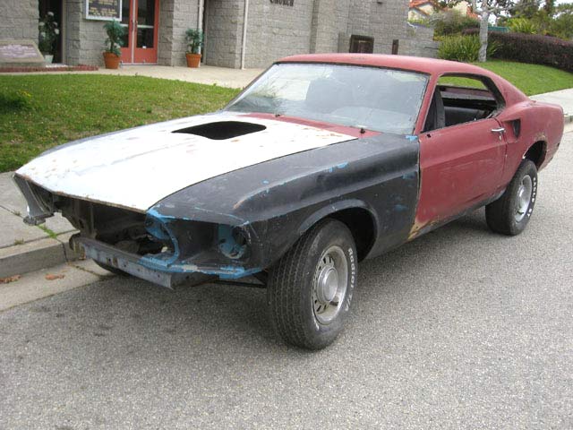 This is a 1969 R code Mach 1. Restoration has been started on this car by a previous owner. Most of the major rust repair has been done. Although the floorpans are replacement style floorpans (with the different ribbing configurations and the extra hole). We did an inventory and the car almost complete except for a rear valance, bumpers and small finish items such as interior screws, new upholstery, etc. Some suspension parts are needed such as the steering linkage so the front wheels point the same direction. Shaker is missing small inner lid and flapper on upper cover. No Tranny.